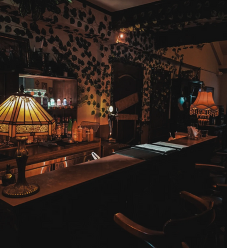 A prohibition-style hideaway with dim lights and vintage décor, ideal for mid-game strategy, banter, and brief escapes.